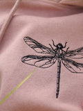 Features: Dragonfly embroidery on front, kangaroo pocket, adjustable drawstring hood