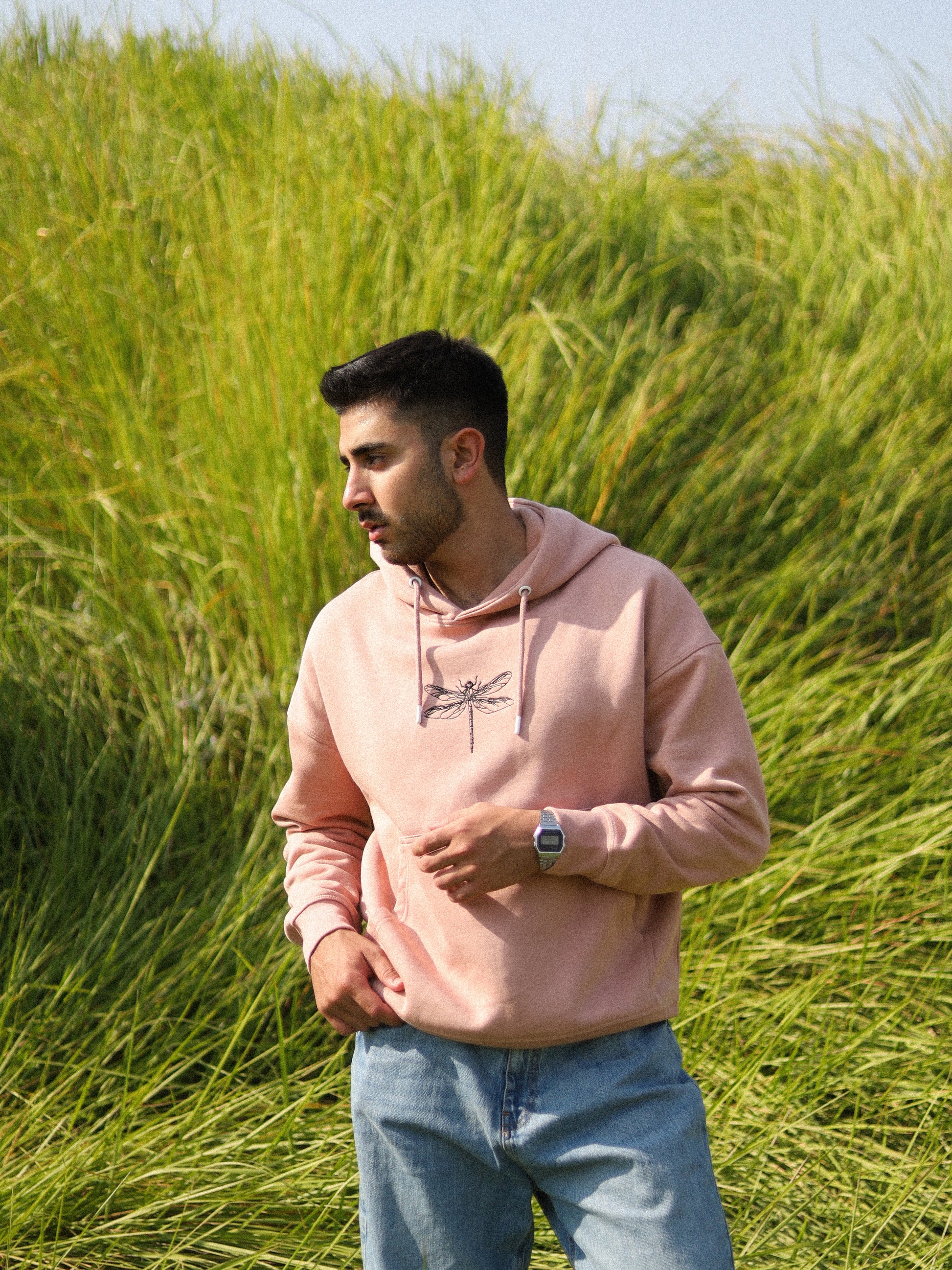 it features a dreamy pink design, crafted from a cozy blend of premium cotton. The intricate dragonfly embroidery design on the chest captures the elegance of nature in motion. This hoodie is the most versatile piece in the first capsule as it can be paired with different fabrics and silhouettes, whilst keeping you warm!